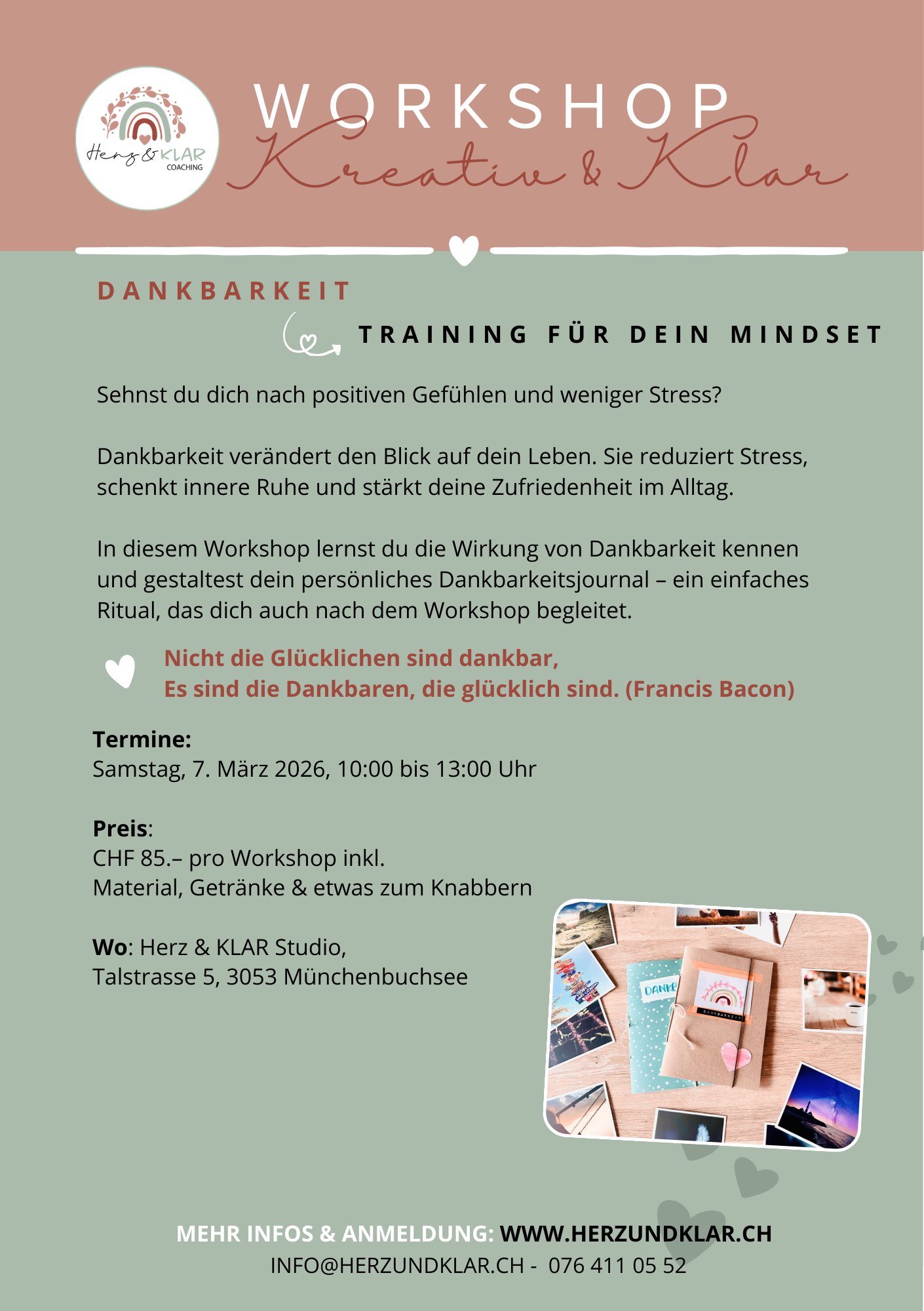 Möchtest du meine weiteren Workshops nicht verpassen, schreib mir gerne eine E-Mail an info@herzundklar.ch. Ich schicke dir das laufende Programm zu, sobald es online ist